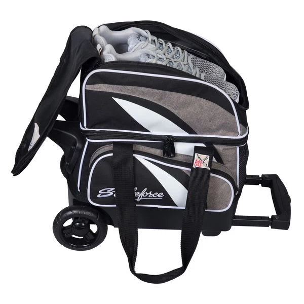 The KR Strikeforce Cruiser Single Roller has 4″ wheels and a retractable square locking handle that extends to 39″ for a quiet and easy ride through the bowling alley. This bag holds 1 bowling ball, accessories, and a pair of shoes.
